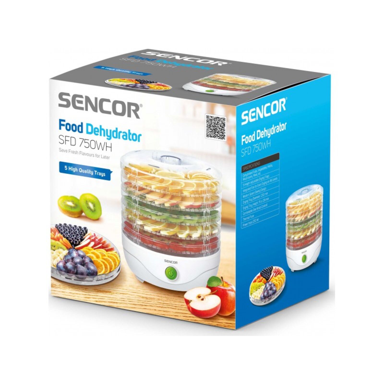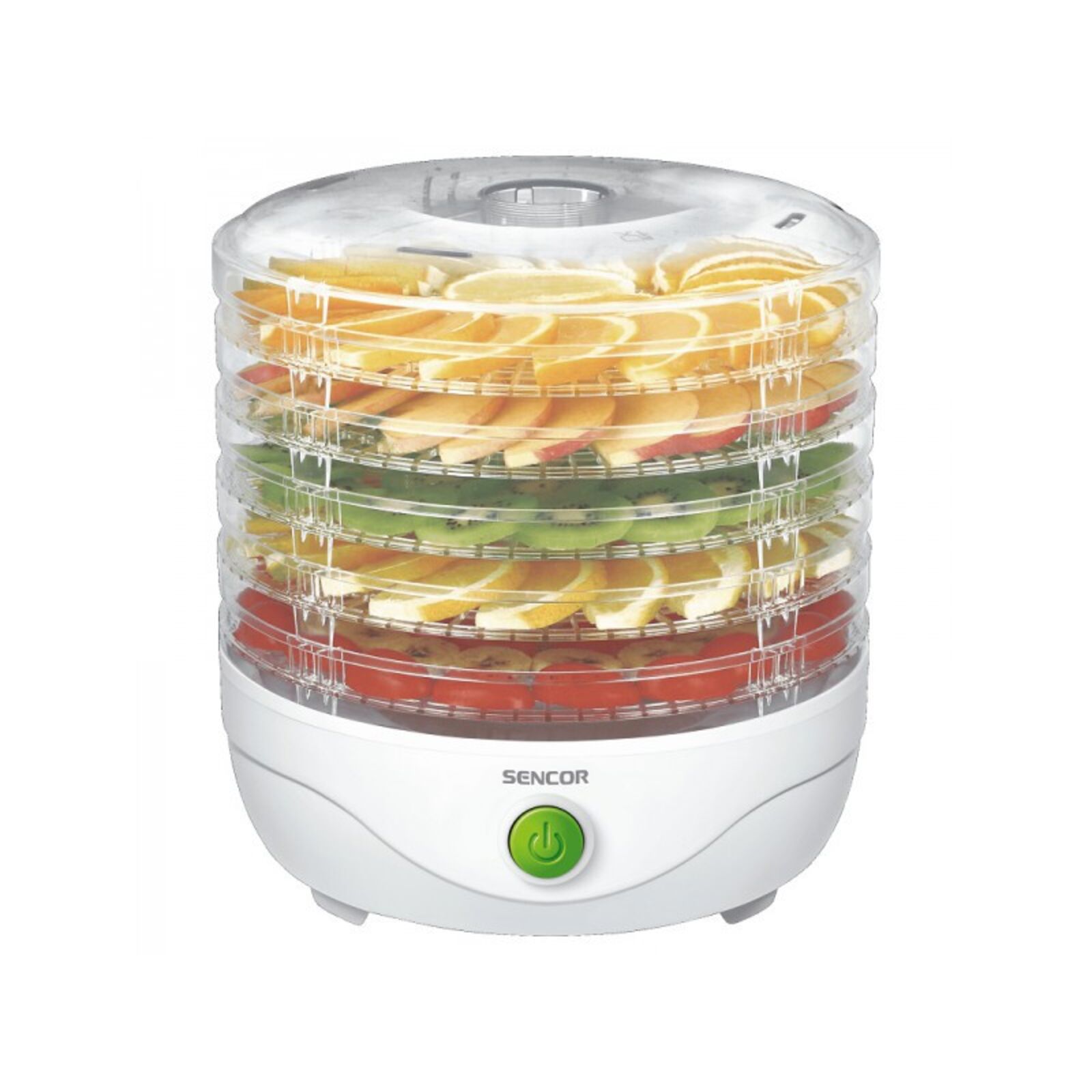 5 db szárító szita, alaptartozék Helytakarékos üzemeltetés, kevesebb szita használatával (egy szitával is működtethető) A szárító szita átmérője: 23 cm A szárító szint hasznos magassága: 2,5 cm A beépített ventilátor biztosítja a szárítási folyamat egyenletességét minden szinten A szárító sziták kivitele meggátolja a penészesedést, és optimalizálja a levegő áramlását Az átlátszó fedélen és a szitákon keresztül szemmel követhető a szárítás folyamata A szárító szitákat és a fedelet mosogatógépben is el lehet mosni Túlmelegedés elleni védelem Teljesítményfelvétel: 250 W Hálózati vezeték hossza: 0,9 m