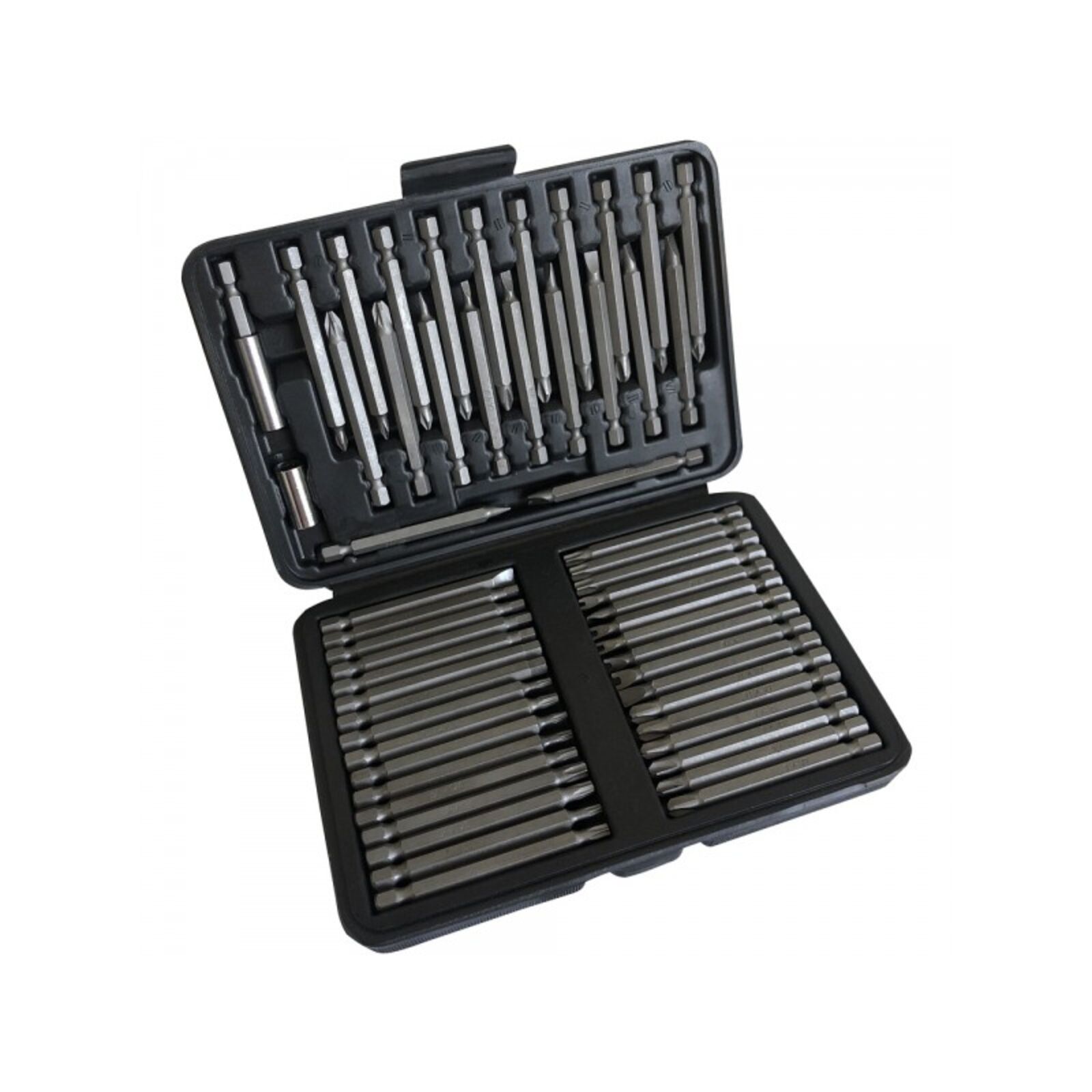 Bitkészlet 55db 53db Bit 75mm: - Phillips: ( 0; 1; 2; 3)*2 - Pozi: 0; 1; 2; 3 - Hasadék: (3mm; 4mm; 5mm; 6mm)*2; 7mm - Hex: (4mm; 5mm; 6mm)*2 - Torx: (T10; T15; T20; T25; T30; T40)*2 - Klucs: ( 4; 6; 8; 10)*2 - Körmös készlet: ( 6; 8; 10)*2 1db 60mm Mágneses bittartó 1db Kuplung