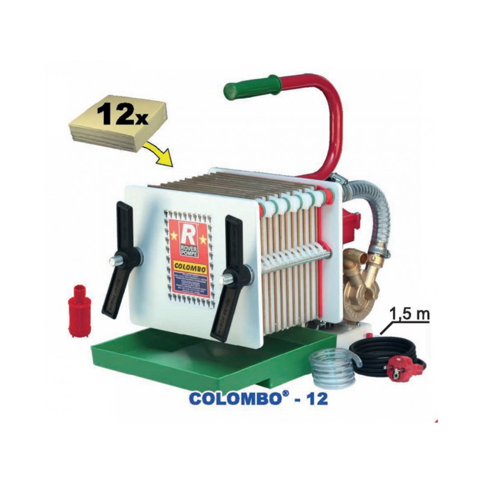ROVER Colombo-12 lapszűrő Telj.: 300-400 liter/óra Festett váz 12 db 20x20 szűrőlap (2x12db-os csomaggal, 1durva és 1 közepes) szállítva BE-M20 szivattyúval szerelve Súlya: 18 kg Méretei: 46 x 30 cm x 28 cm