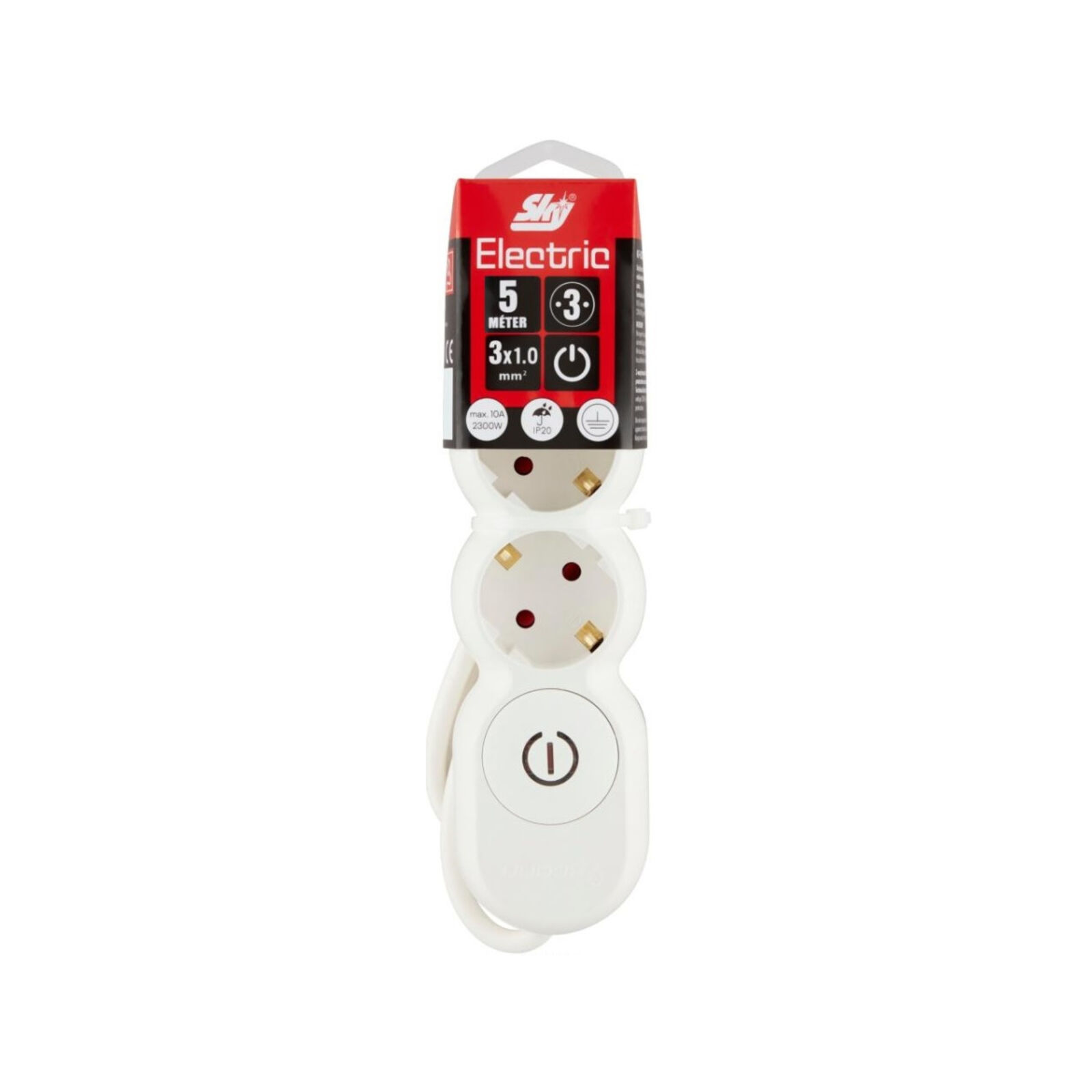 - kapcsolós hálózati elosztó - 3 db aljzattal ellátott - a biztonságos használat érdekében IP 20 védelemmel és gyermekvédelemmel ellátott - fehér színű elosztó - beltéri használatra - 5 m hosszú 1,5 mm2 kábellel felszerelt - műanyag akasztóval ellátot