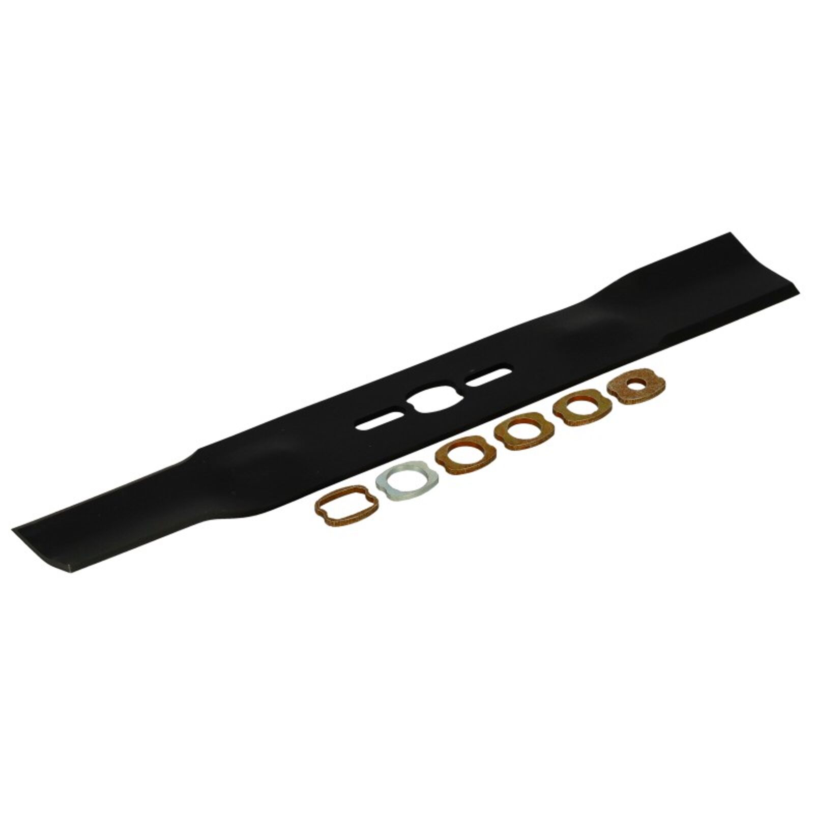 Univerzális, egyenes fűnyírókés, 5 darab különböző méretű szűkítő betétgyűrűvel. Betétgyűrűk mérete: 9,5mm/ 12,7mm/ 14,3mm/ 15,9mm/ 19,05mm Hossz:450mm Középső lyuk átmérő:25,4 Szélső lyukak átmérője:10x28mm Szélesség:50mm Vastagság:4mm Típusok: Több gyártmány: