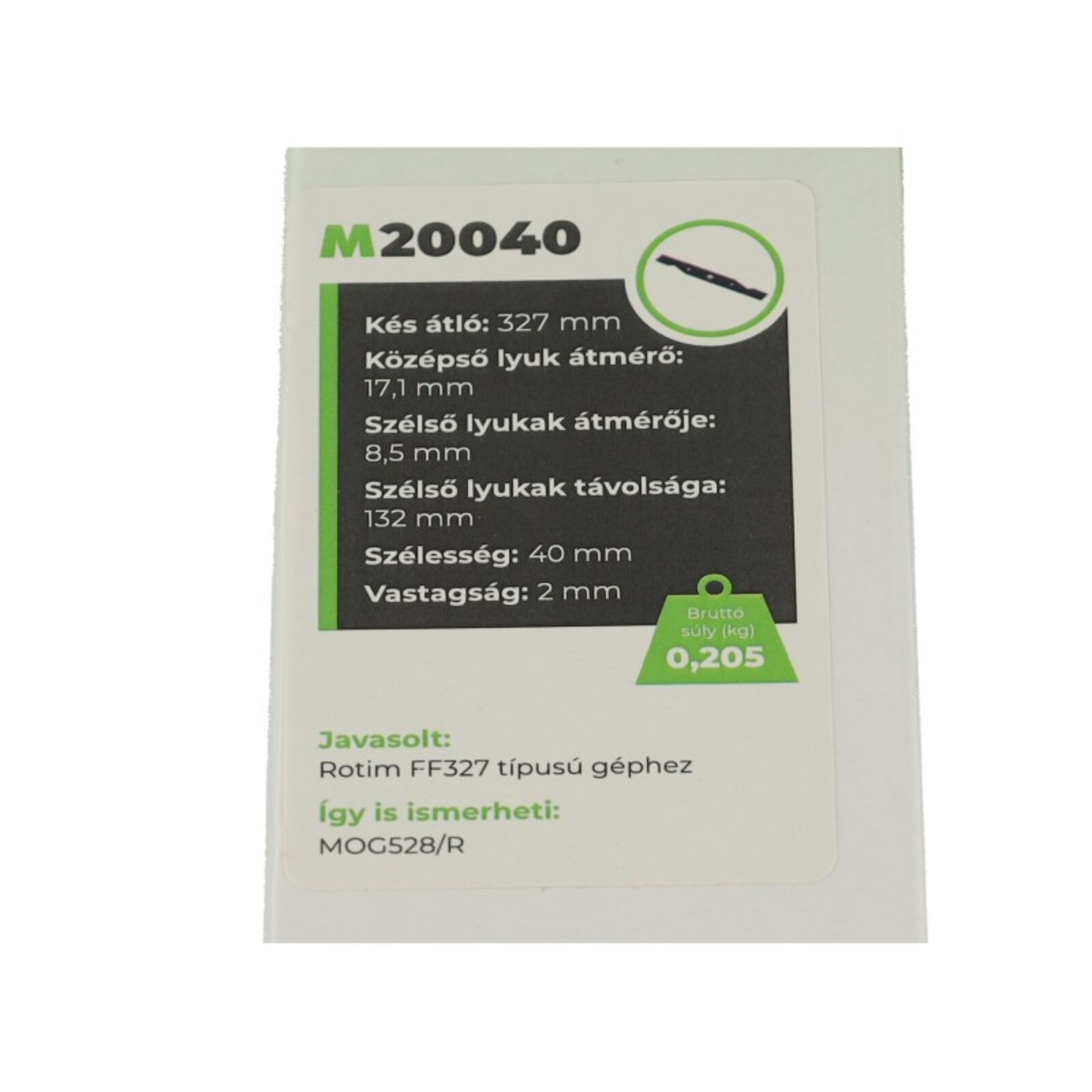 Rotim FF327 típusú géphez fűnyírókés. Kés átló:327mm Hossz:325mm Középső lyuk átmérő:17,1mm Szélső lyukak átmérője:8,5mm Szélső lyukak távolsága:132mm Szélesség:40mm Vastagság:2mm Típusok: MAMMUT: Rotim Mini Lux FF327,