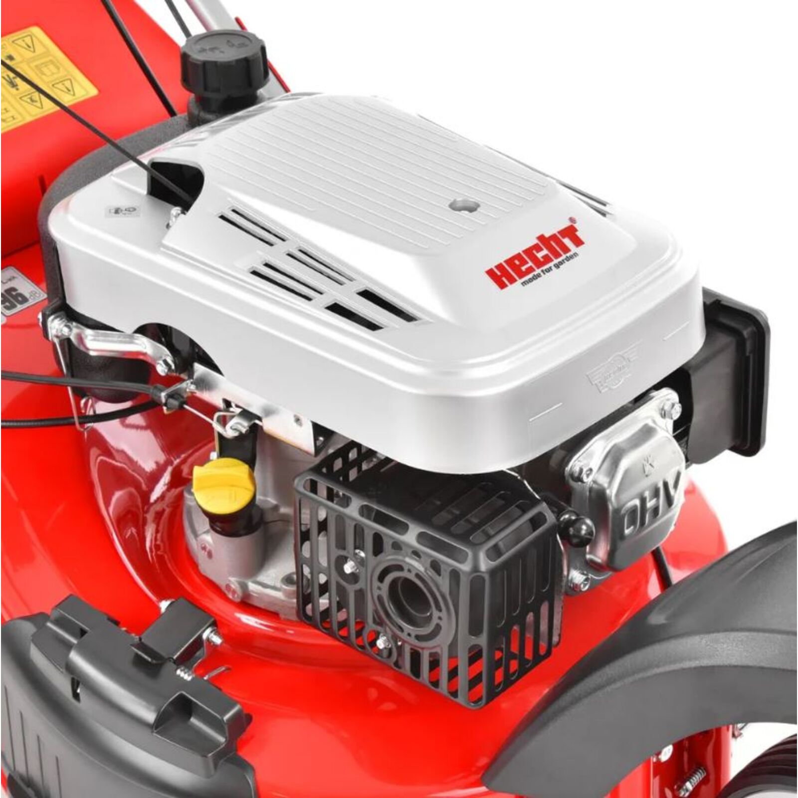 A meghajtásról a 135 cm3, 5 HP HECHT OHV motor gondoskodik. A motor teljesítménye elegendő úgy a fűnyíráshoz, mint az önjáró kerekek meghatásához. A fűnyíró menetsebessége kb. 3,3 km/h. A stabil, erős fémy ház oldalkidobóval is rendelkezik. Tartozékként adjuk az oldalkidobó toldatát, aminek segítségével a nagyra nőtt füvet is le tudja vágni úgy, hogy a gép kezelőjének nem kell taposnia a levágott füvön.