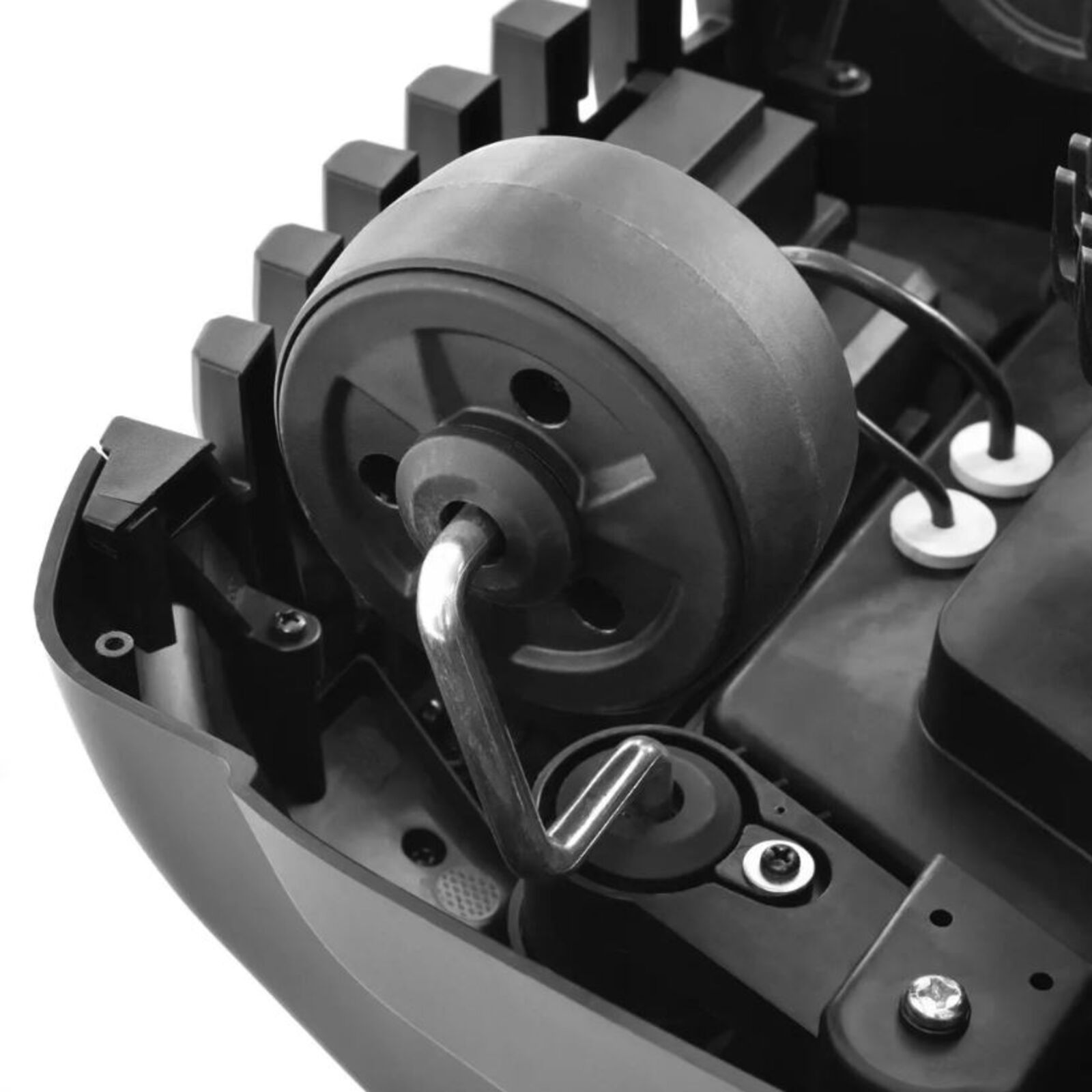 A fűnyírót PIN kód védi a lopás ellen. A tudta nélkül a fűnyírót nem lehet elindítani, így a fűnyíró a tolvajok számára használhatatlan. A fűnyíró alatt teljesen elrejtett fej három pengével forog, ami veszélyes lehet a fűnyíró felemelésekor vagy felborulásakor. Ezért a gép érzékelőkkel van felszerelve, amelyek biztosítják, hogy a kések azonnal leálljanak, amikor a fűnyírót felemeli. Egyéb előre nem látható helyzetekre a fűnyíró felső burkolatán egy nagy gombbal van felszerelve, amely szintén bármikor azonnal leállítható. A vágási magasság 20-60 mm között állítható.