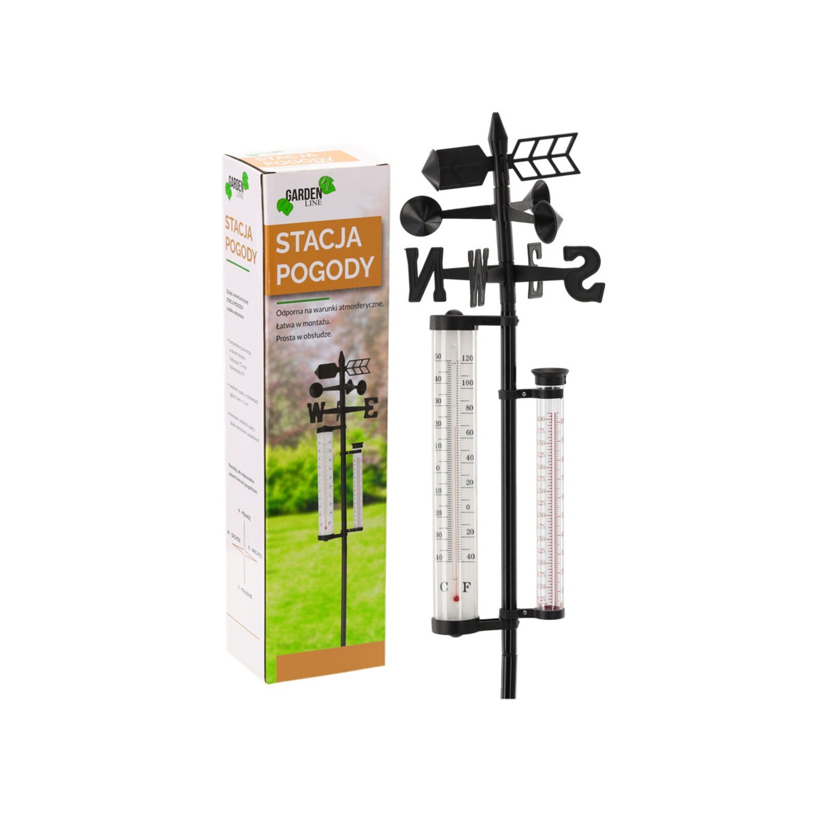 Kövesse nyomon egyszerűen az időjárás változását. Ezzel az eszközzel pontosan naplózhatja, hogy mennyi csapadék hullott, merről fúj a szél, illetve leolvashatja az aktuális hőmérsékletet is. A leszúrótüskének köszönhetően könnyen és gyorsan telepíthető, áthelyezhető. A rúd tetejéről leolvashatóak az egyes égtájak irányai is. Gyorsan összeszerelhető Strapabíró fém és műanyag Nagyméretű hőmérő Celsius és Fahrenheit mértékegységek Csapadékmérés mm-ben Szélkakas a szélirány és szélerősség mérésére Beépített égtáj jelző Méret: 140 cm x 22 cm +/- 5% Anyag: Fém / Műanyag Hőmérő skála: -40 - (+50)°C Csapadékmérő skála: 0 - 100 mm Szín: Fekete