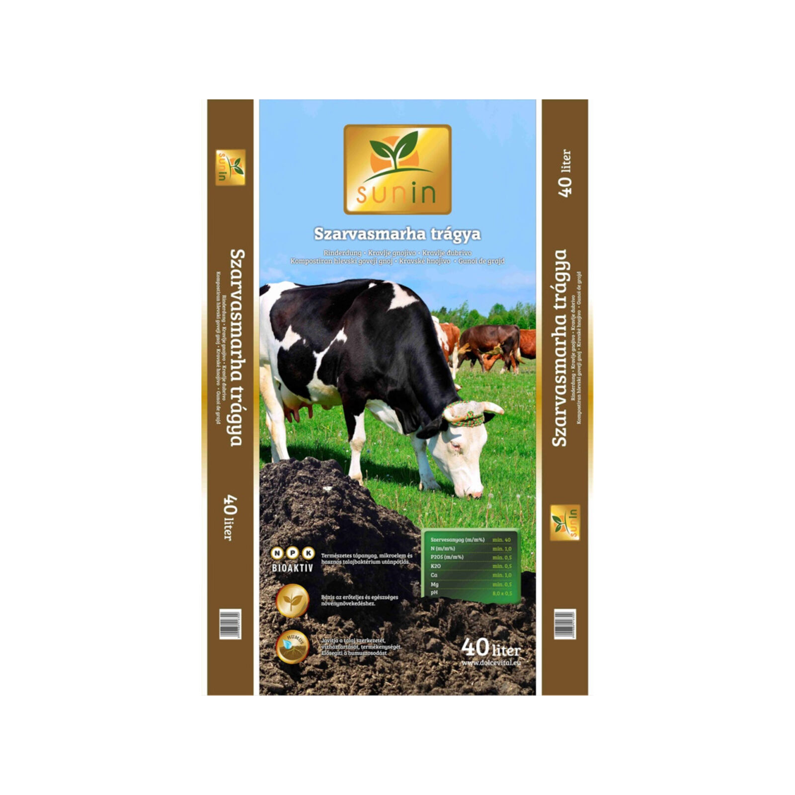 8,0+-0,5 pH Kiváló minőségű komposzt szarvasmarha trágya. Felhasználható szerves anyagban és mészben szegény talajok javítására, gyümölcsfák, díszfák, szőlő telepítésekor termesztő közeg alkotórészeként. Összetétel: 100% szarvasmarha trágya. Kiszerelés: 40liter és 20 liter A szabadtartásból származó szarvasmarha trágyát gondos odafigyeléssel komposztáljuk, így egy érett, száraz, idegen anyagoktól mentes alapanyagot használunk termékünkhöz.