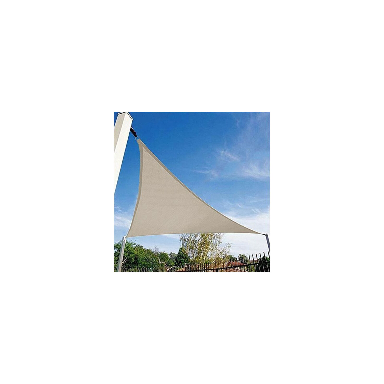 A háromszög alakú árnyékoló ponyva a forró nyári napokon véd meg a tuzo napsugaraktól. Rögzítse a ponyvát 3, egymástól kelloen távol levo oszlophoz. A ponyva sarkain fém karikák találhatóak, amelyekkel kifeszítheti a ponyvát. Bézs színu, poliészterbol készült, amely ellenáll a víznek és az UV sugaraknak.