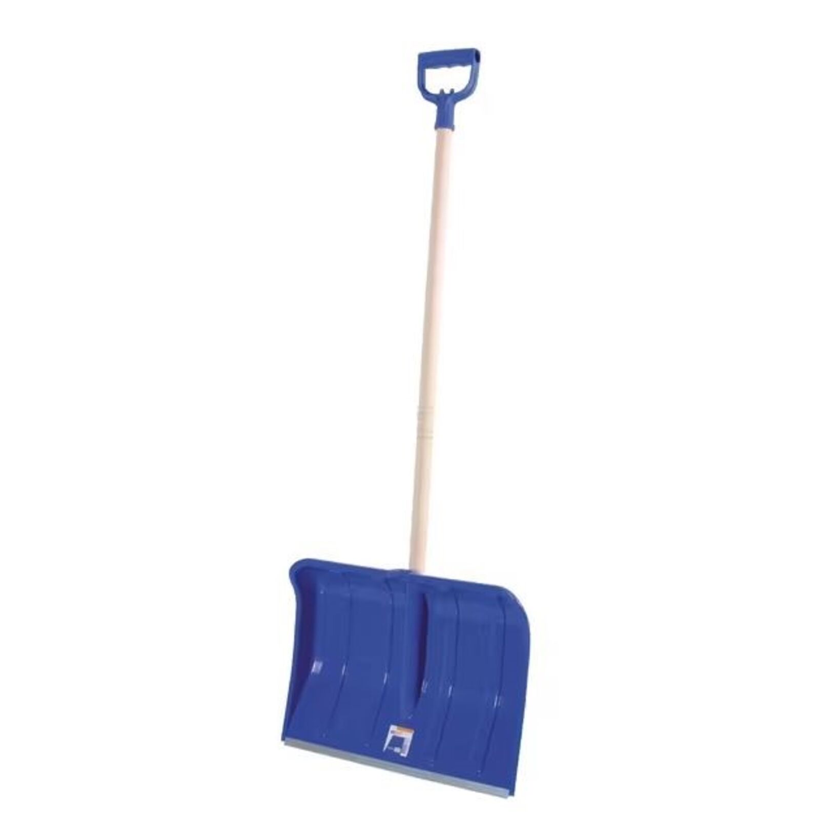 Kék műanyag hókotró alumínium kopócsíkkal és fa markolattal.