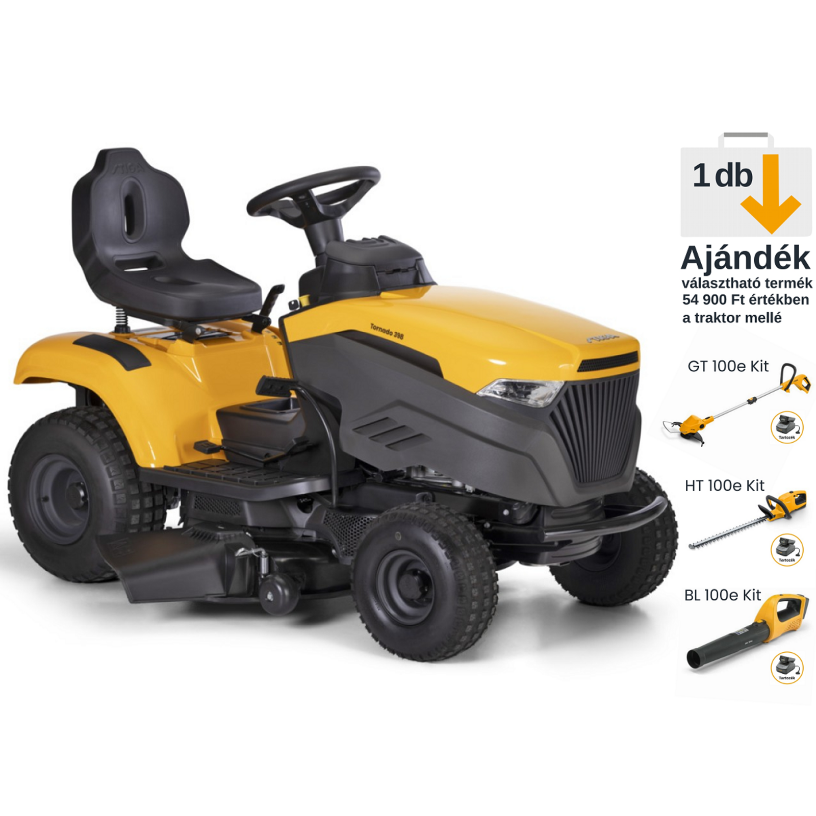 Most a promócióban résztvevő traktorok mellé ajándék választható. Az ajándéktermékek részletes leírása a termék cikkszámának megadásával érhető el. (GT 100e Kit: 271102108/ST2, HT 100e Kit: 271302108/ST2, BL 100e Kit: 271504108/ST2). A STIGA Tornado 398 jó választás azok számára akik nem akarják a levágott füvet összegyűjteni, mert a mulcsozó és a fejlett oldalsó kidobós funkció hatékonyan kezeli a magas füvet is. Nagy teljesítményű, egy hengeres, 7.5 kW-os STIGA motorral, hidrosztatikus hajtással, 98 cm-es két késes vágóasztallal, 7 vágási magasságállítással 25 és 80 mm között és elektromágneses késindítással. Kétoldali mosó csatlakozó. A Tornado 398 puha markolatú STIGA New Comfort kormánnyal és kényelmes STIGA New Comfort üléssel van szerelve. A vonószem és a mulcsozó készlet az alapfelszereltség része. A traktor hátrameneti vágás funkcióval, vezetőkerekekkel a vágóasztalon és lökhárítóval van szerelve.