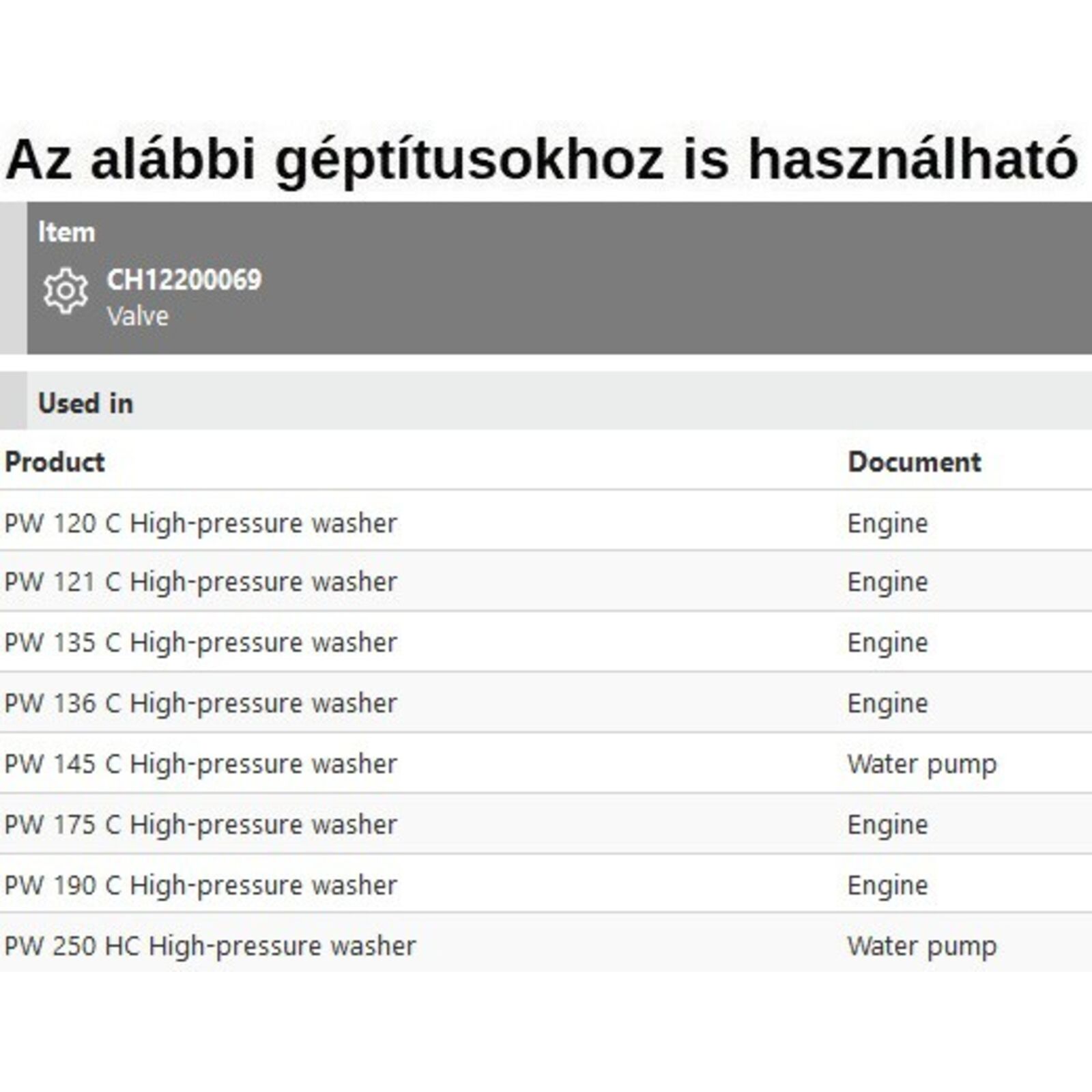 Szelep PW 120C-121C-135-136C-145C-175C-190C-250HC