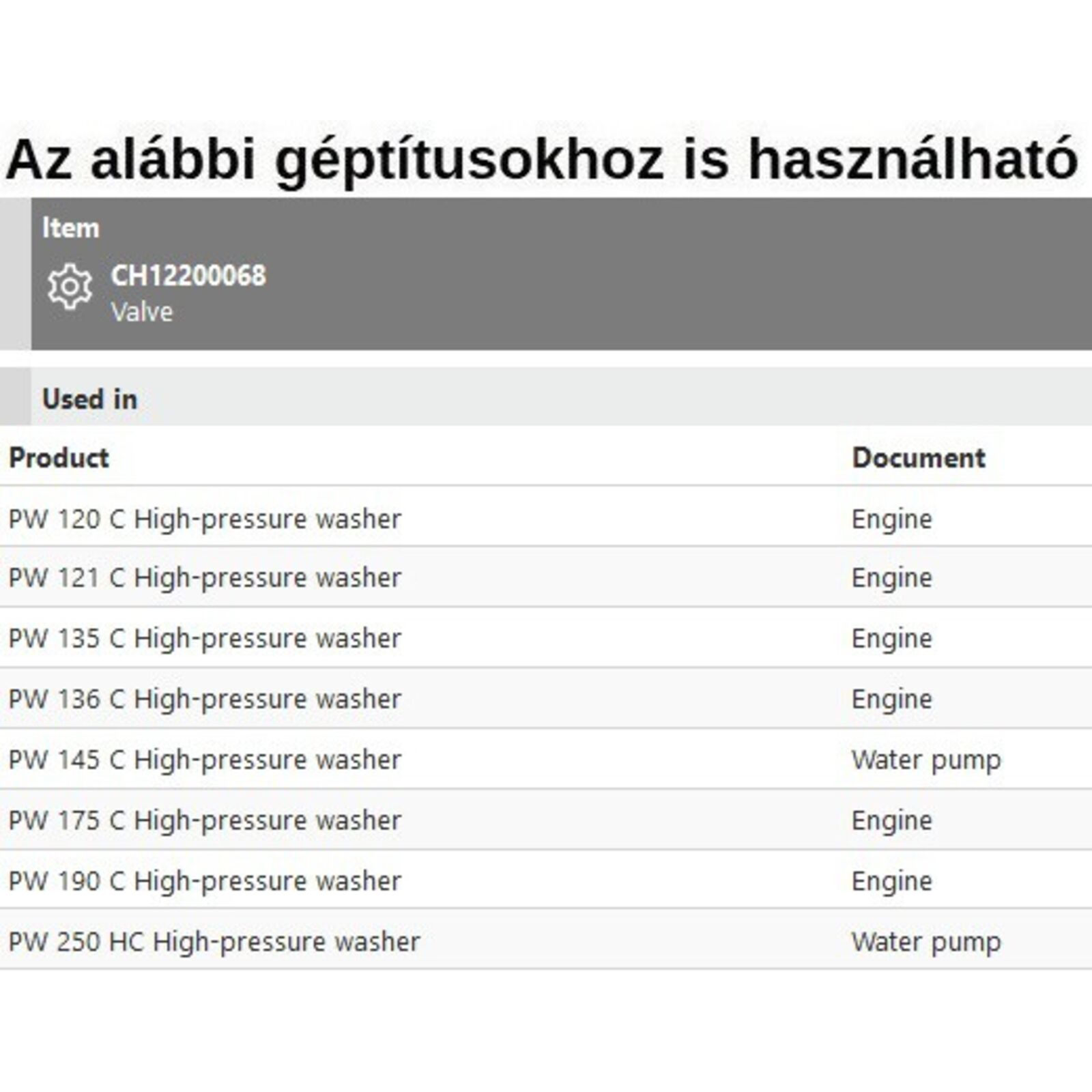 Szelep PW 120C-121C-135-136C-145C-175C-190C-250HC