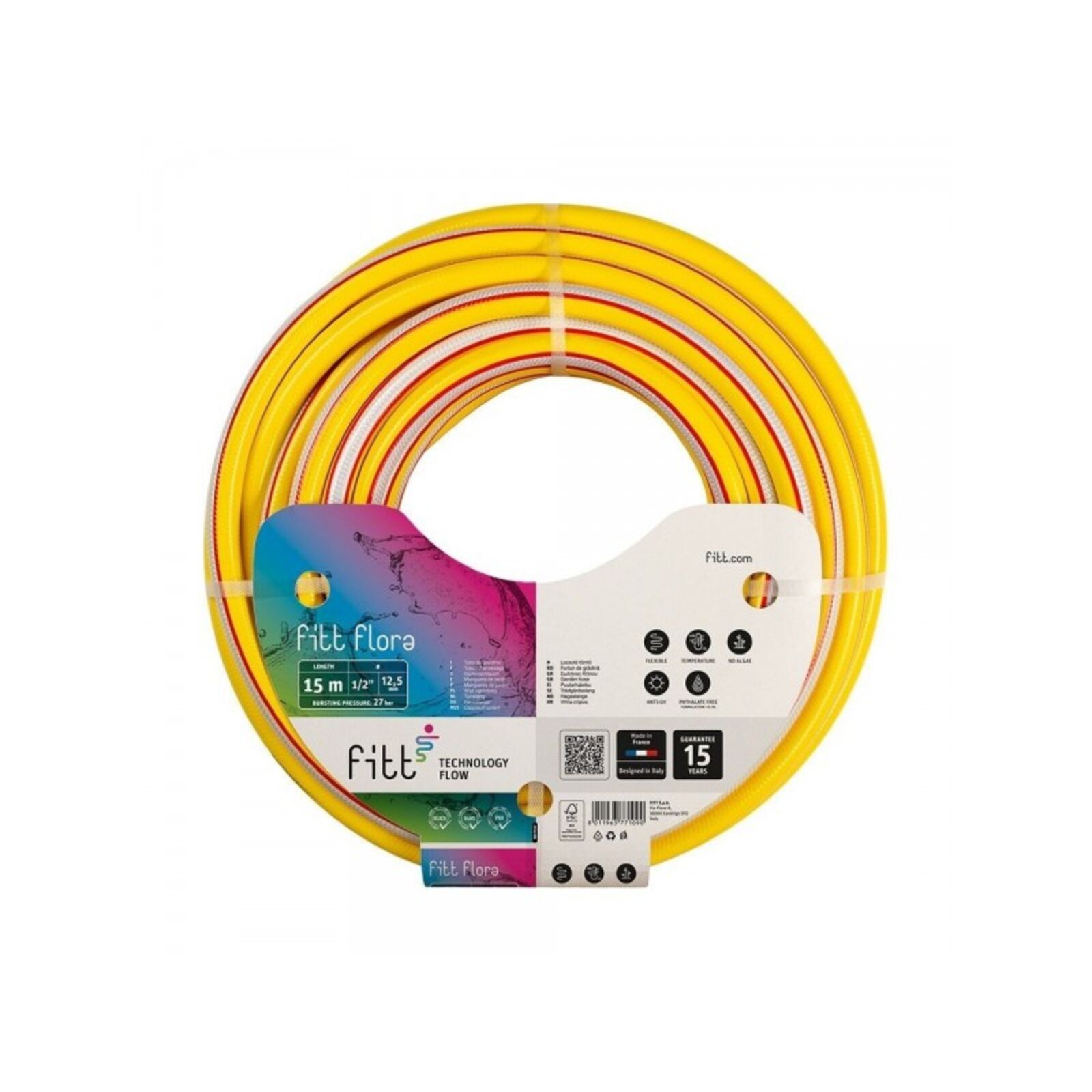 FLORA 7 bar üzemi nyomásra 5 rétegű: -fedett sárga külső réteg széles, piros extrudált csíkkal -horgolt szálerősítés biztosítja a csavarodásmentességet -fehér tartó réteg középen -fekete réteg az algásodás megakadályozására -fehér belső réteg -hőmérséklet tartomány -15 és +50C°között -UV stabil
